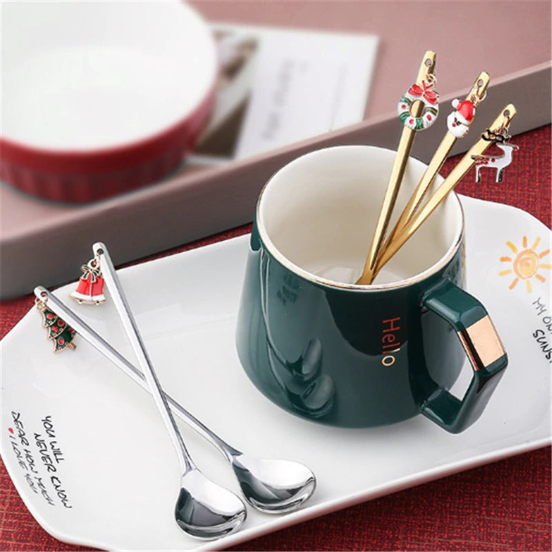 Dale una linda vista a tu mesa con cucharitas navideñas de acero inoxidable. Vienen en colores dorado y plateado, con diferentes diseños de colgantes.