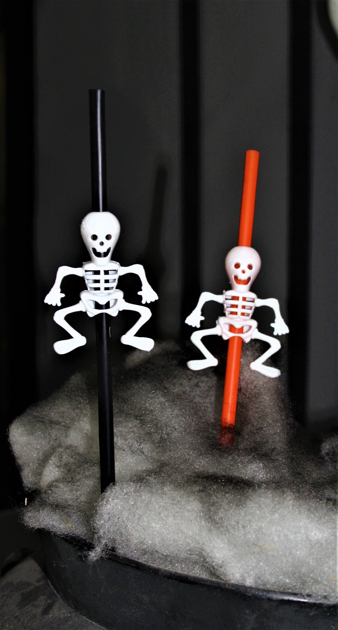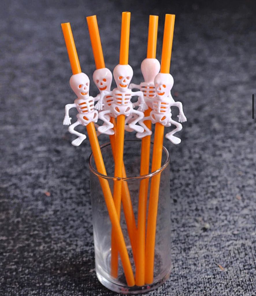 Popotes para bebidas con figuras de esqueleto en la parte superior, ideales para tu fiesta de Halloween.